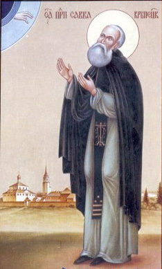 Преподобный Савва Крыпецкий был пострижен на Афоне, откуда прибыл в Псков. Он начал подвизаться на Снетной горе в Богородичной обители, близ Пскова, затем перешел в более уединенное место на речку Толву, в обитель преподобного Евфросина (память 15 мая). Наконец, он удалился на совершенное безмолвие в Крыпецкую пустынь, за 15 верст от Толвы, и поселился один при небольшом озере в непроходимом лесу. Пищею отшельника были хлеб и вода, а в среду и пятницу он ничего не вкушал. В отшельнической жизни много он претерпел от нечистых духов, но всегда побеждал их молитвой. Спустя несколько лет уединенной жизни к преподобному Савве стали собираться ревнители пустынной жизни. Они упросили его учредить обитель и построить храм в честь апостола Иоанна Богослова. Преподобный отказался быть игуменом обители и поручил управление иноку Кассиану. К строгому старцу приходили многие из Пскова, которых он исцелял и увещевал, но ни от кого не принимал даров. Однажды Псковский князь Ярослав Васильевич Оболенский, который часто посещал обитель, приехал к святому вместе с больной супругой. Преподобный Савва послал сказать ему: «Старец, грешный Савва, говорит тебе, князь, не вступай в обитель с княгинею; у нас здесь такое правило – жены не должны входить в обитель: если преступишь отеческую заповедь, княгиня твоя не получит исцеления». Князь просил прощения, что по незнанию хотел нарушить устав. Преподобный Савва вместе с братией вышел за ворота и отслужил молебен. Княгиня исцелела. По ходатайству князя в 1487 году Псков получил грамоту на землю для обители. Мирян преподобный учил соблюдать чистоту, напоминая о суде Апостольском против сквернителей тела. Богатым и судьям говорил, чтобы не кормились за счет бедных и соблюдали правду. Часто напоминал всем уклоняться от ссор и вражды, сохранять любовь и мир и покрывать ошибки других снисхождением, дабы и нас простили. В обители с самого начала было введено строгое общежитие. И тогда, когда собралось довольно братии и средств, в келье преподобного не было ничего, кроме двух икон, мантии и рогожки, на которую он ложился отдыхать. Той же нищете он обучал братию. Преподобный заповедал им возделывать землю своими руками. Он говорил: «К чему называем мы древних подвижников своими отцами, когда не живем их жизнию, как следует детям. Они бездомные, нищие, проводили время в вертепах, в пустынях и для Господа со всей твердостью покоряли свою плоть духу, не знали покоя ни днем, ни ночью. Возлюбим, дети, благого Господа, не звуками только и одеждою будем показывать любовь нашу к Нему, а делами: любовью друг ко другу, слезами, постом, всяким воздержанием, как совершали это древние отцы». Благодарный князь построил через мхи и болота мост к обители длиною в 1400 сажен. После своей кончины († 28 августа 1495) преподобный Савва не оставил обители, а много раз оказывал защиту. Однажды ночью к монастырю подошли разбойники. Но они увидели благолепного старца, который, держа в руке жезл, грозно велел им покаяться. Наутро узнали, что в монастыре такого старца не было, и поняли, что это являлся сам преподобный Савва. Предводитель разбойников покаялся игумену и остался жить в монастыре. Преподобный Савва был высок ростом, с бородой седой, как снег, круглою, густою и не очень долгою. В таком виде он явился в середине ХVI века иноку Исаии, указав, где нах